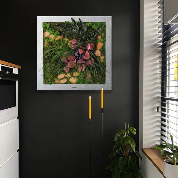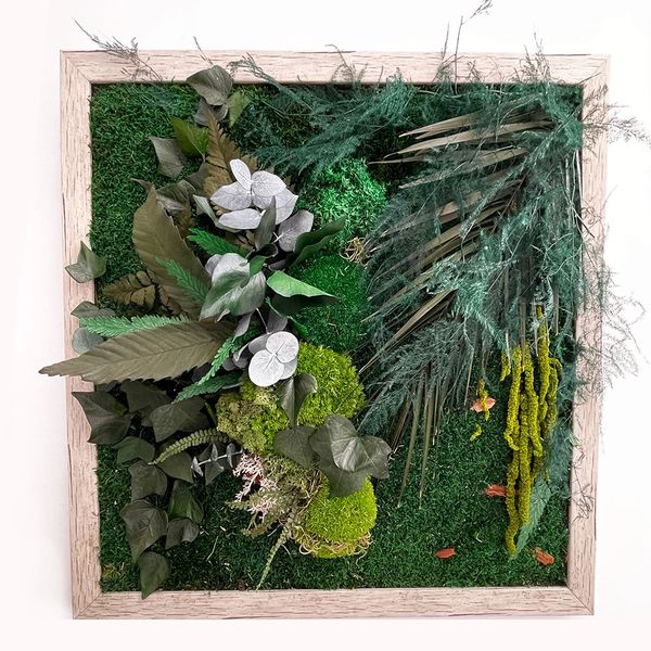 DETAILS: • Handmade Wall Art • Wood Frame/Silver Texture, Size: 49cmX49cmX2.5cm • Materials: Combination of ferns, moss and natural wood pieces • Hanging hardware attached