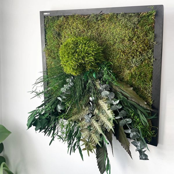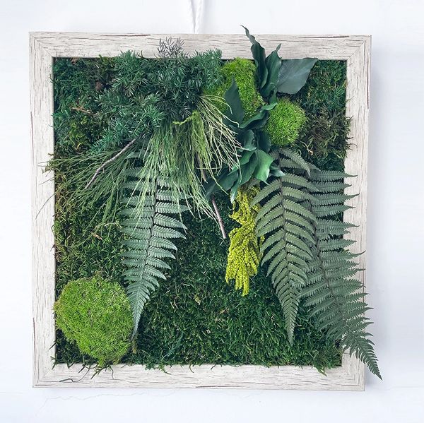 DETAILS: • Handmade Wall Art • Wood Frame/White, Size: 60cmX60cm. • Materials: Combination of ferns & moss • Hanging hardware attached