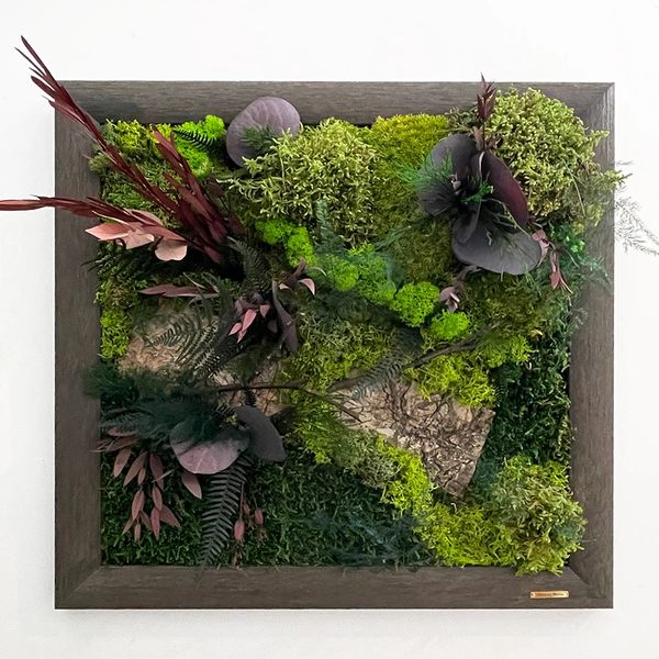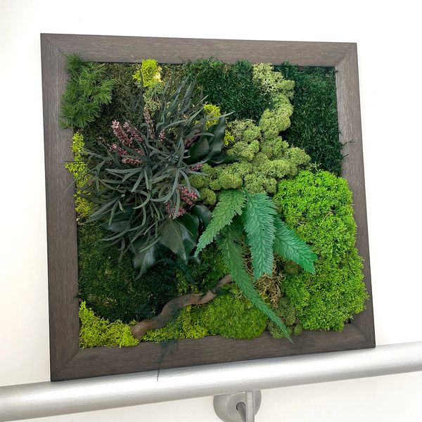 DETAILS: • Handmade Wall Art • Wood Frame/Brown, Suitable for hanging on a wall or placed on a table/desk Size: 32cmx32cm • Materials: Combination of ferns & moss • Hanging hardware attached