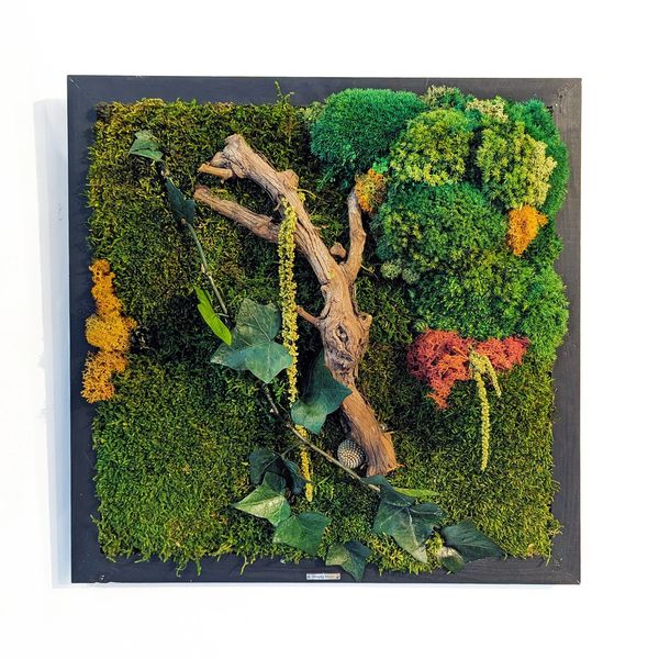 DETAILS: • Handmade Wall Art • Wood Background/Black, Size: 50cmX50cmX2cm • Materials: Combination of moss and natural Oak woods • Hanging hardware attached CARE: • DO NOT WATER • For indoor use only. Keep out of direct sunlight • Bright indirect light is fine. Detailed instructions are included with shipment